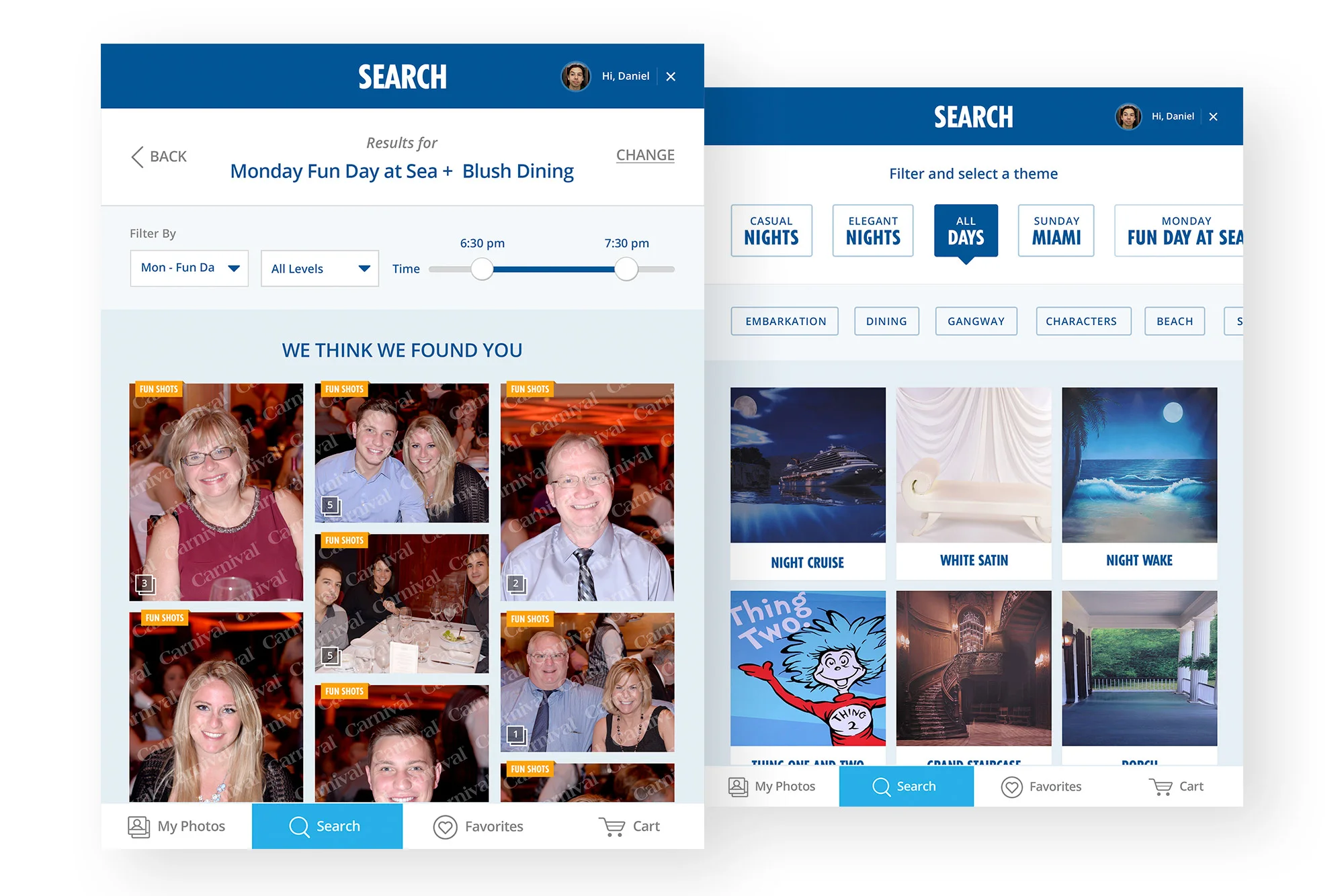 For vacationers, photos are prime currency—memories that can be shared on social networks today and revisited privately for years to come. And for the Carnival brand, capturing and selling these photos is a big business. But for a long time, getting your photos meant walking into a room with thousands of analog prints. That’s why we set out to transform the experience. It’s fun to take photos, so our challenge became to make sure the on-ship photo experience was equally as engaging and fun to do. We built a digital platform and gallery space that was functional, while still representing the fun personality of the overall brand.